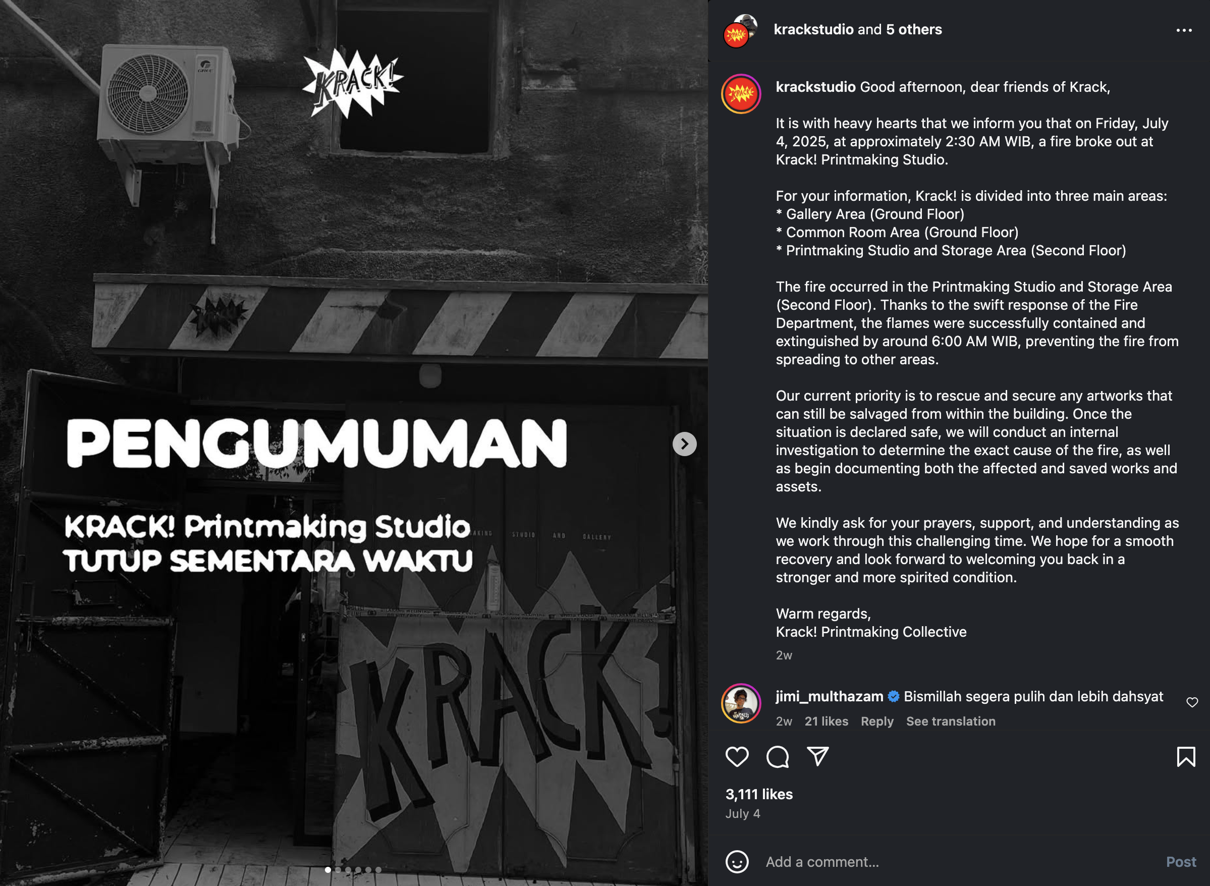 Early on the morning of Friday 4 July, an electrical fire broke out at Krack Print Studio in Yogyakarta. The studio and office space were gutted, all printmaking equipment destroyed and Krack’s 12-year archive of print work was lost. Fortunately, no one was in the building at the time. 16albermarle Project Space, (which is partnering with Krack on the touring exhibition Pasar Malam | Night Market, soon to open in Semarang and beginning a seven-venue Australian tour in Darwin in early 2026) has invited Krack’s Australian friends and supporters of Southeast Asian art to contribute to a fund to assist in the building of a new Krack studio. The intention is to rebuild in a new location with effective storage for works on paper, well-ventilated work areas, professionally installed electricals and a water filtration system for the wet area.