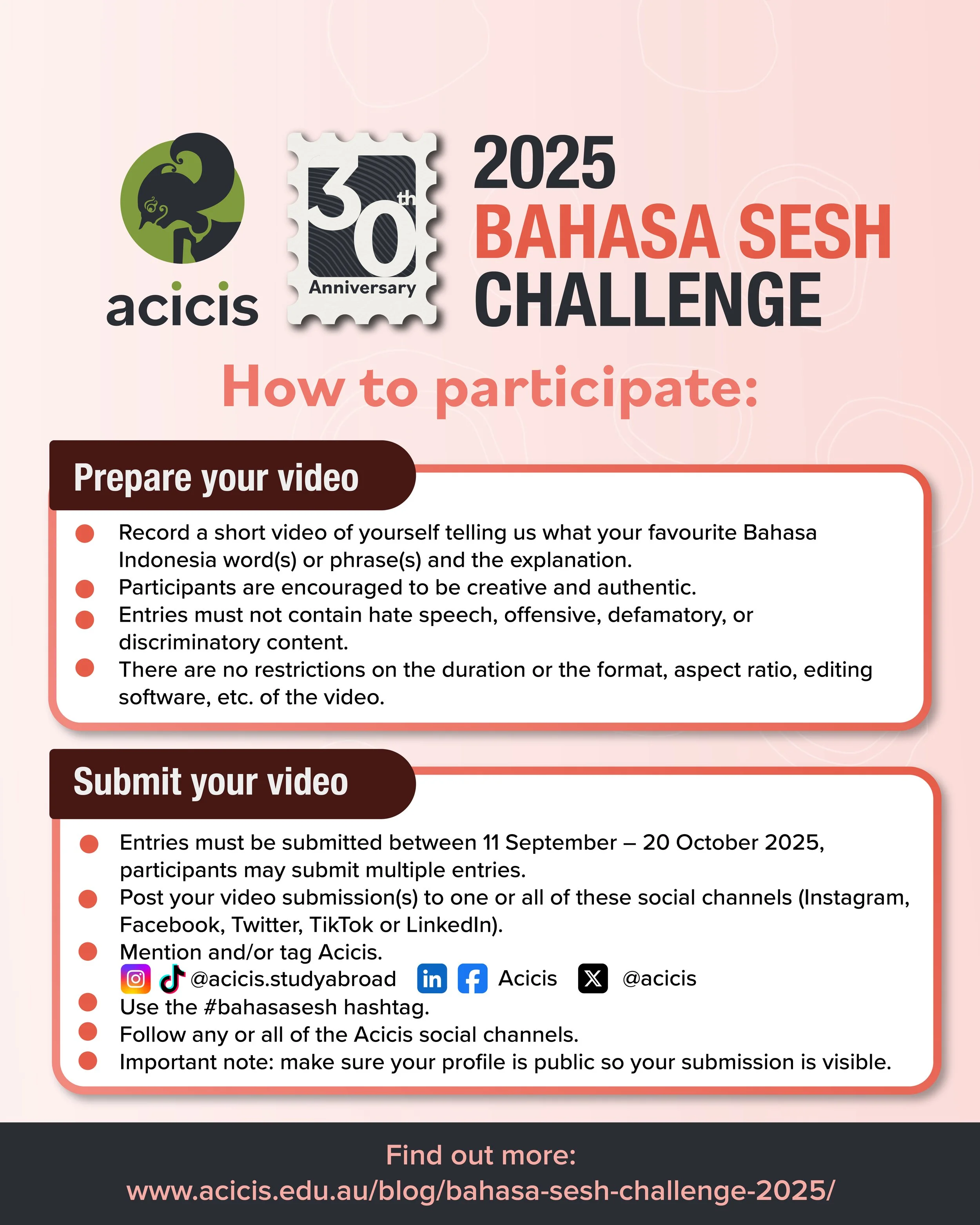 To celebrate 30 years of deepening Australia–Indonesia ties, ACICIS has relaunched the Bahasa Sesh Challenge—a sosmed initiative running until 20 October 2025 that invites Australians to reconnect with Indonesia through language.